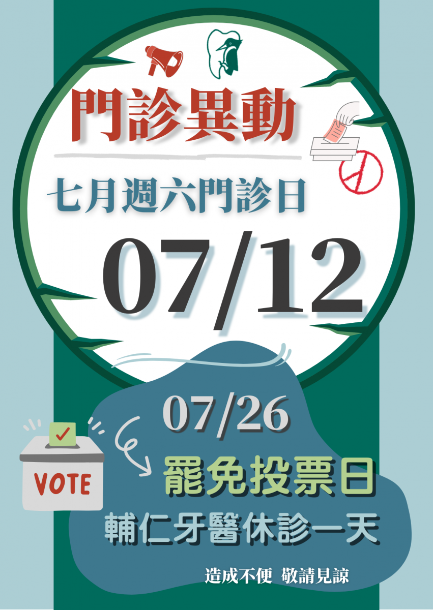 原定114/07/26(六)為門診日,因政府ㄢ宣布114/07/26(六)舉辦罷免投票日 因應於此,輔仁牙醫調整114/07/26(六)為休診日, 原114/07/26(六)已預約患者,輔仁牙醫將於近期去電改期,造成不便敬啟見諒。